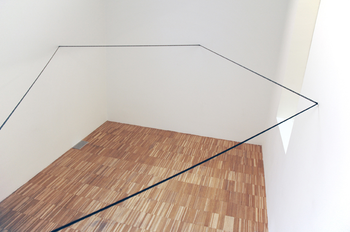 A peça “While I walked across the room” (Enquanto eu caminhava pela sala) é composta de uma faixa de borracha preta, com as palavras impressas em branco, que é instalada como um labirinto, a 1,63m do chão, no nível dos olhos do artista. O texto impresso narra um passeio através de uma sala, que o espectador lentamente explora, de acordo com o que ele está lendo enquanto caminha. No entanto, a narração impressa não corresponde à sala em que a peça está montada. Criam-se então duas sensações: a que se desenha a partir do texto e outra elaborada a partir da existência da instalação. Forma e conteúdo. Memória e percepção.